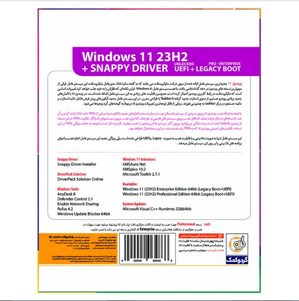 این محصول شامل نسخه 24H2 UEFI ویندوز 11 گردو با قابلیت نصب به صورت UEFI به همراه راهنمای فارسی نصب و فعالسازی است. همچنین در این مجموعه نرم افزار Snappy Driver برای نصب درایورهای سیستم قرار داده شده است.