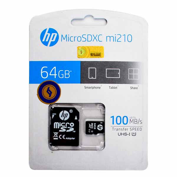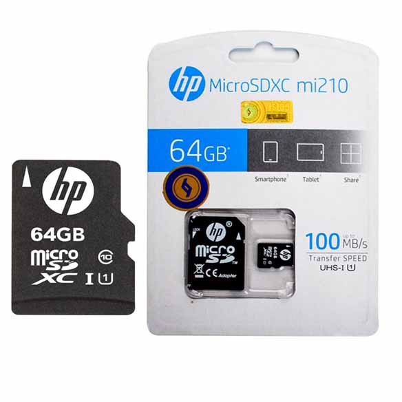 کارت حافظه 64 گیگ اچ پی (HP) مدل MicroSDXC UHS-I mi210 سرعت 100MB (گارانتی 24 ماهه حافظه طلایی ایستا)