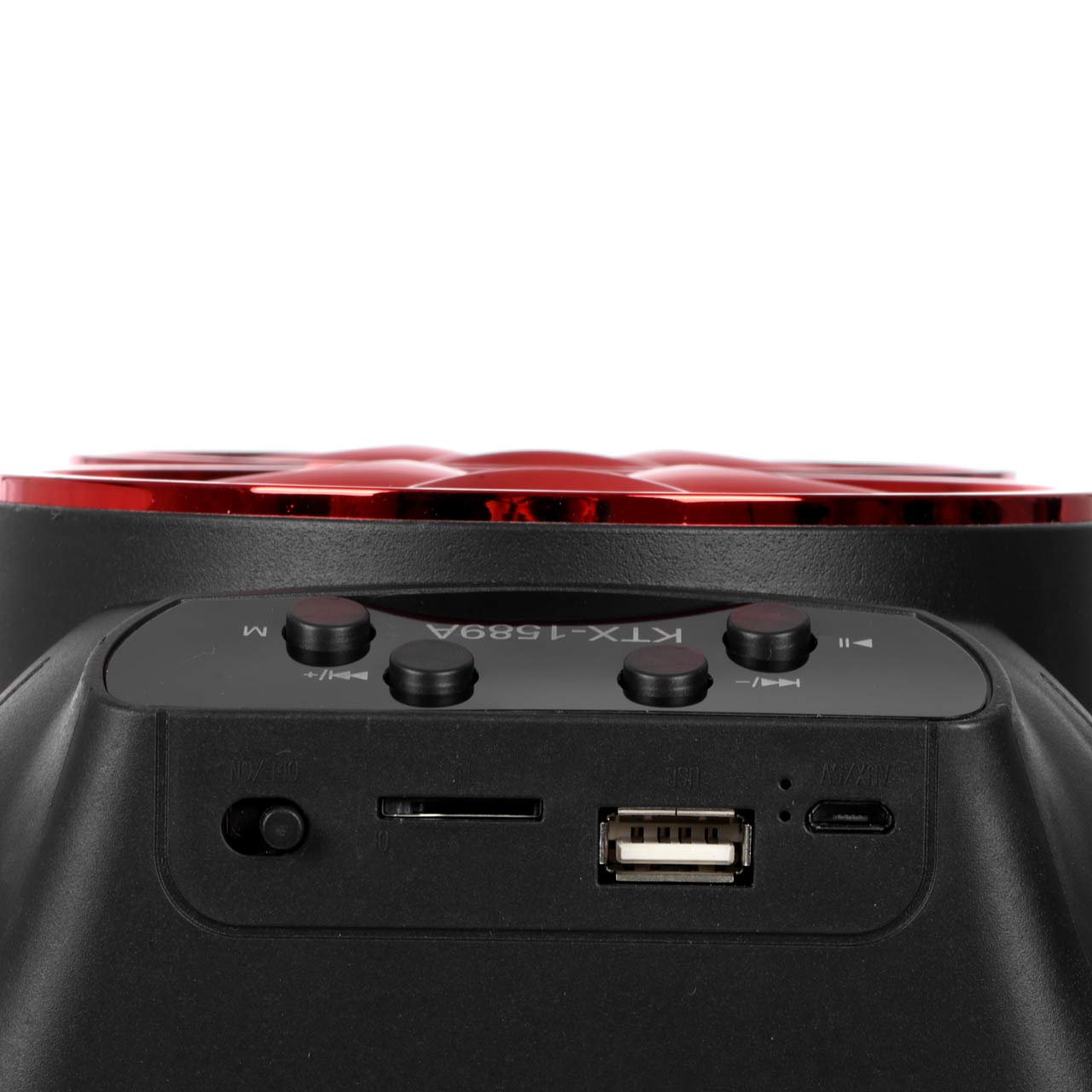 اسپیکر مدل KTX 1588A با داشتن دو بلندگوی 3 اینچی با ابعاد 10*10*25 سانتی متر ، یک پرتابل اسپیکر با وضوح صدای مناسب برای مکانهای کوچک است که با ابعاد و وزن مناسبی که دارد قابلیت جابجایی راحت و استفاده در مکان های مختلف را برای شما فراهم میکند تا بتوانید از طریق بلوتوث / مموری کارت و یا فلش موزیک دلخواهتان را اجرا کنید و از شنیدن صدای آن لذت ببرید. داخل هر دو باند این اسپیکر چراغهای LED رنگی قرار دارد که زیبایی بیشتری به این اسپیکر می بخشد. باطری 1200 میلی آمپر اسپیکر تا بیش از 3 ساعت پخش موزیک با صدای بلند را برای شما فراهم میکند و برای شارژ کامل باطری 2ساعت زمان نیاز دارد. این اسپیکر رادیو FM هم دارد که به کمک دکمه ها باید موجهای رادیو بصورت خودکار فعال شود.