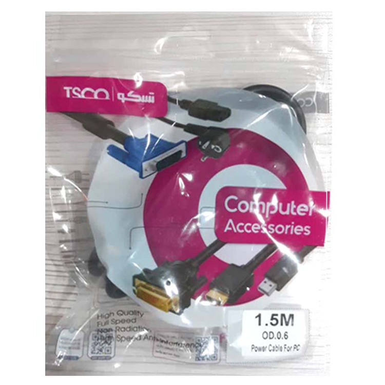 کابل برق TSCO به طول 1.5 متر به کانکتور خروجی که به یک شیار3تایی مادگی مجهز شده است و امکان اتصال به پورت کیس و مانیتور را فراهم می سازد و همچنین در سمت دیگر آن یک دو شاخه برق تعبیه شده که می توانید مستقیما به پریز برق نیز متصل نمائید. این کابل بدلیل خلوص مس استفاده شده در تولید رشته ها ، افت ولتاژ بسیار ناچیزی دارد و همچنین به دلیل کیفیت بالای رشته ها و ضخامت کابل ، مانع داغ شدن و آسیب رسیدن به تجهیزات الکترونیکی می شود و برای مصارف خانگی و صنعتی مناسب است. این کابل در برابرکشش، پارگی و گره خوردن مقاوم است و قابلیت ضد تداخل و بدون تشعشع و جلوگیری از الودگی الکترومغناطیسی را دارد.همچنین دوشاخه برق و سرسوکت کامپیوتری آن کاملا تو پر و فشرده است که مانع از ذوب شدن آن در شدت جریان های بالا می شود.