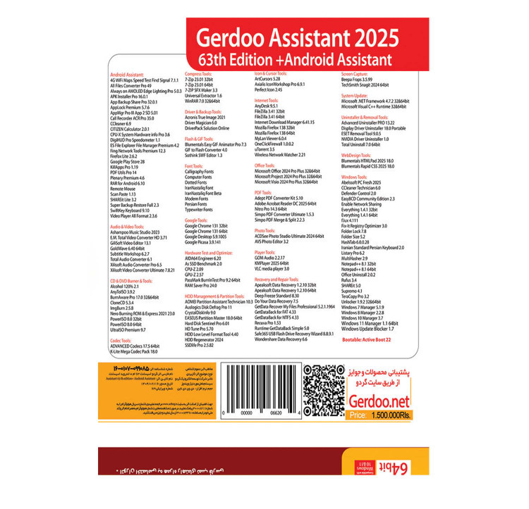 اسیستنت گردو نسخه 63 شامل مجموعهای کامل از نرم افزارهای کاربردی شامل مدیریت گوشیهای اندروید، آنتی ویروس و برنامههای امنیتی، کار با فیلم و موسیقی، رایت دیسک و گرفتن ایمیج، چت و گفتگوی اینترنتی، کدک، درایور، پشتیبانگیری از اطلاعات، ساخت انیمیشنهای گیف، فونت، تست و مدیریت سختافزارها، مرورگرها و ابزارهای اینترنتی، اداری و آفیس، ابزارهای پیدیاف، ویرایش تصاویر، پلیرها، ریکاوری و بازیابی اطلاعات، مدیریت ویندوز و … است.