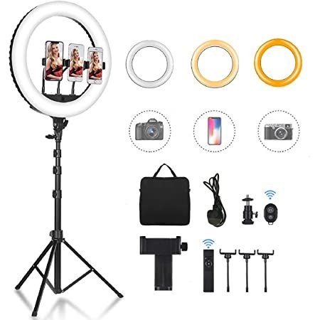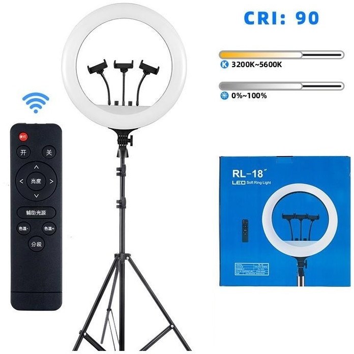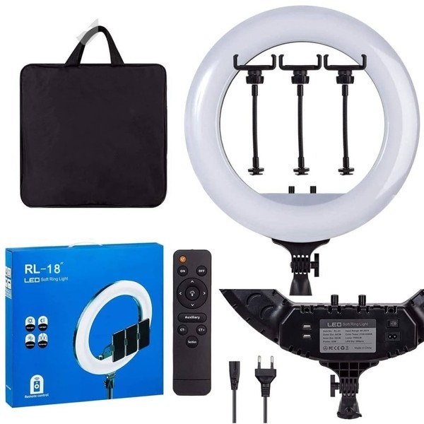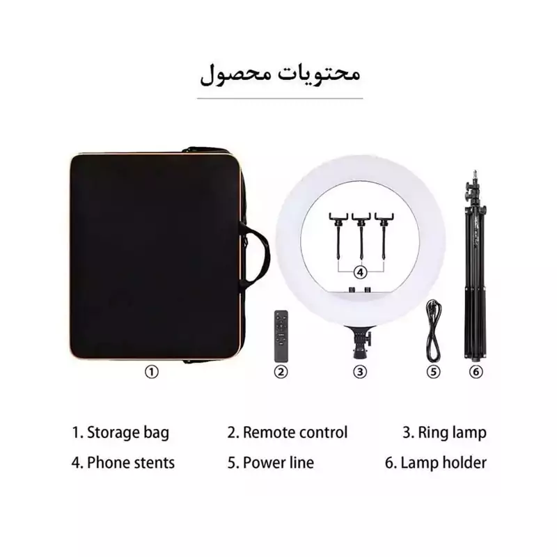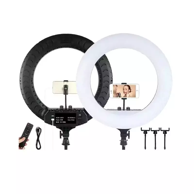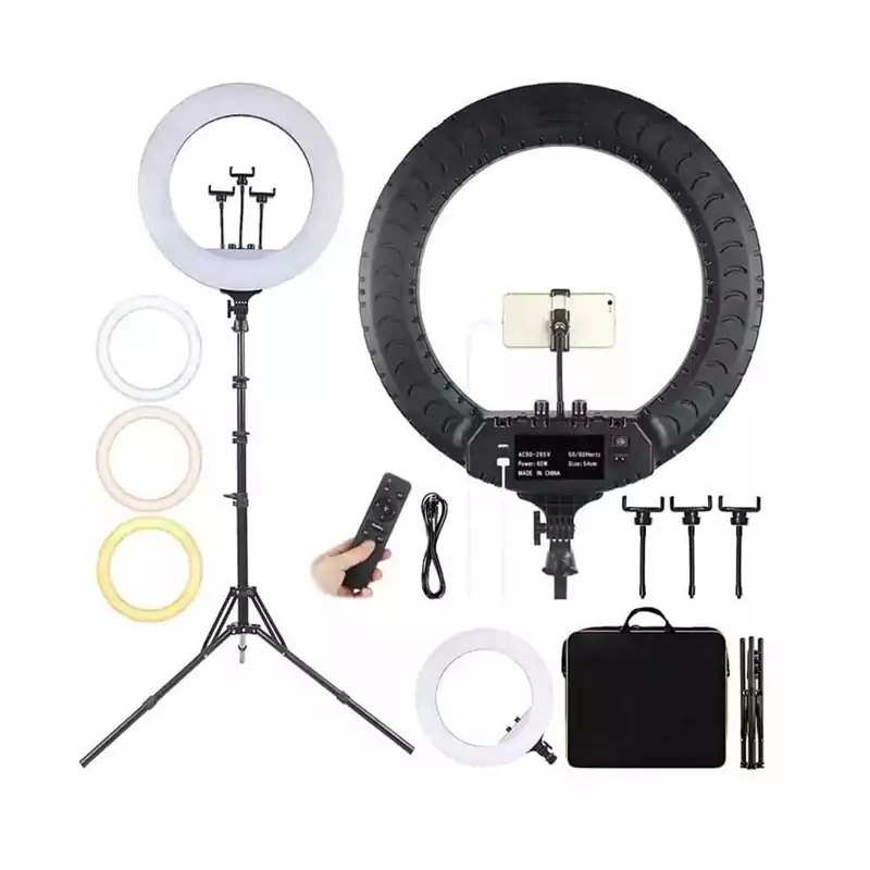 ابعاد 36*47*3 سانتیمتر وزن رینگ لایت 1600 گرم جنس ABS + فولاد + کربن قطر بیرونی 36 سانتی متر قطر داخلی 26 سانتی متر طول پایه 210 سانتی متر دارای 1 عدد پورت USB نوع نور رینگ لایت LED تعداد LED در رینگ لایت 280 عدد کیفیت نور ( CRI ) بیشتر از 90 میزان روشنایی ( Lume ) 3600 LM محدوده قدرت تابش نور 10% تا 100% ولتاژ ورودی 90 – 265 V دمای رنگ 2700 – 6500 K زاویهی نور دهی 360 درجه اقلام همراه : رینگ لایت 14 اینچی،سه پایه 210 سانتی متری،ریموت کنترل،کابل برق 3 متری، 3 عدد نگهدارنده موبایل