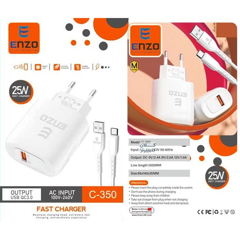 شارژر انزو مدل C-350 دارای پورت خروجی USB با توان خروجی 25 وات بوده که ولتاژ ورودی آن 100 الی 240 ولت می باشد. مجهز به فناوری شارژ سریع با توان خروجی 25 وات و جنس بدنه ساخته شده از پلاستیک بادوام مقاوم در برابر آسیب های فیزیکی و سازگار با انواع دستگاههای هوشمند نظیر گوشی های هوشمند و تبلت می باشد. داخل جعبه این شارژر یک عدد کابل شارژر از نوع تایپ سی قرار داده شده است.