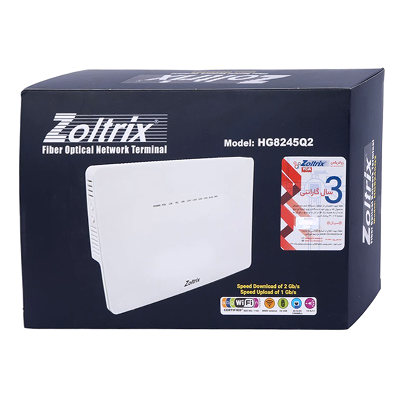 مودم روتر فیبر نوری زولتریکس مدل HG8245Q2 NEW از چهار پورت شبکه 1 گیگ با سرعت 1000Mbps برای اتصال به رایانه شخصی، ست تاپ باکس (STB)، یک پورت تلفن (RJ-11) برای ارتباطات صوتی و دو پورت USB برای اشتراک گذاری فایلها از طریق شبکه بی سیم (WLAN) پشتیبانی میکند. مودم Q2 در دو نوع کانکتور فیبرنوری UPC و APC تولید میشود. با ورودی فیبر نوری SC-APC و قدرت آنتن دهی بالا (3 آنتن 2 دسی بل) به همراه 2 خروجی تلفن این مودم از کیفیت بسیار بالایی برخوردار است. همچنین قابلیت گیتوی VOIP را نیز داراست.