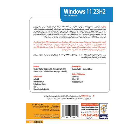 خرید ویندوز Windows 11 23H2 گردو سازگار با سیستمهای جدید و قدیمی در نسخههای مختلف به همراه اسیستنت (Assistant)، اتودرایور (AutoDriver) و اسنپی درایور (Snappy Driver) در قالب 1 حلقه DVD9 (9 گیگابایتی) ارائه شدهاست.از آنجا که ویندوز 11 به سیستمهای سختافزاری جدید با قابلیت پشتیبانی از TPM نیاز دارد، با غیر فعال کردن این ویژگی، امکان نصب Windows 11 23H2 بر روی سیستمهای قدیمی و ناسازگار بدون نیاز به TPM فراهم میشود. بنابراین فرفی ندارد که کامپیوتر یا لپتاپ شما از ویژگی TPM پشتیبانی میکند یا خیر، در هر صورت این نسخه از سیستمعامل ویندوز 11 آپدیت 23H2 برای شما مناسب است.