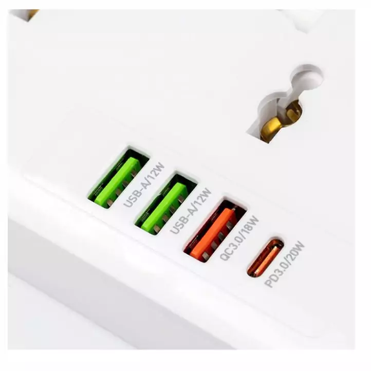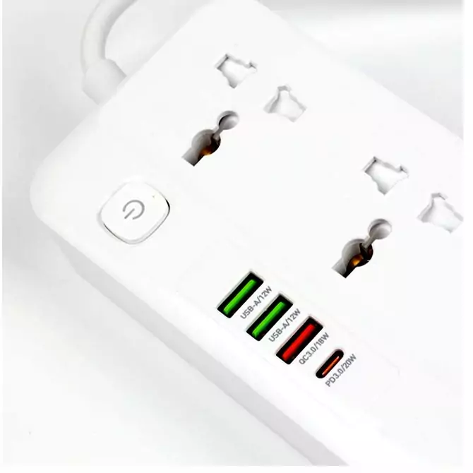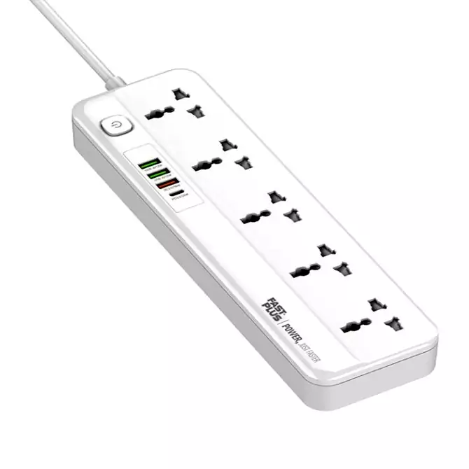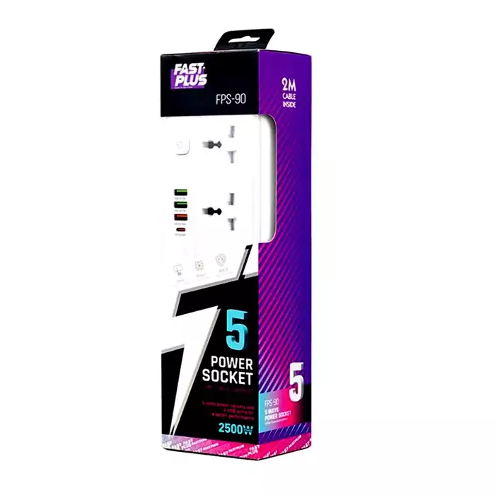 چندراهی برق فست پلاس مدل FPS-90 با تعداد پریز های بالا و خروجی USB نیاز شما را در خانه و محل کارتان برطرف می کند. این چند راهی از 5 خروجی برق بهره می برد که با انواع دو شاخه و سه شاخه ها سازگاری دارد. و دارای دو پورت USB-A با توان 12 وات، یک پورت USB-A با فناوری QC با قدرت 18 وات و یک پورت Type-c با فناوری PD با توان 20 وات بهره می برد. این محصول قابلیت تحمل حرارت ناشی از اتصال کوتاه تا 850 درجه سلسیوس را دارد، همچنین دارای دکمه قطع و وصل کلی جریان برق می باشد که روی بدنه دستگاه به صورت فشاری جای گذاری شده است. طول کابل این چند راهی 2 متر می باشد.