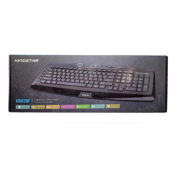 کیبورد بی سیم KINGSTAR مدل KB83W محصولی با طراحی زیبا و استاندارد است که ابعاد آن در حدود 10 × 180 × 640 میلی متر می باشد. تعداد کلیدهای این کیبورد 117 عدد با عمر کلیدپذیری 8میلیون بار است. همچنبن دکمه های کیبورد این محصول دارای حروف حک شده فارسی است و با توجه به شیوه حک باکیفیت دارای ماندگاری نیز می باشد. کیبورد کینگ استار به صورت جزیره ای طراحی شده و دارای دکمه های تخت می باشد. این محصول دارای سه چراغ LED می باشد که برای اعلان روشن یا خاموش بودن کلیدهای Num Lock، Caps Lock و Scroll Lock است. برق این کیبورد از طریق یک عدد باتری قلمی تامین می شود.همچنین کیبورد kb83 دارای 13 کلید میانبر به منظور انجام سریعتر کارهاست که عبارتند از Web Home, email, Search, Refresh, Favorite, Music, Play/Pause, Stop, Pre. Track, Next Track, Mute, Volume. کیبورد کینگ استار مدل kb83، برای استفادههای روزمره مناسب است. از دیگر ویژگیهای این کیبورد محصول کمپانی کینگ استار، طراحی کلیدها به گونهای که امکان تایپ کردن در مدت زمانی طولانی را فراهم می کند، دسترسی راحت به تمامی کلید های کاربردی، طراحی نرم و سایلنت کلید ها، با دوام و دارای کلید های مات میباشد.